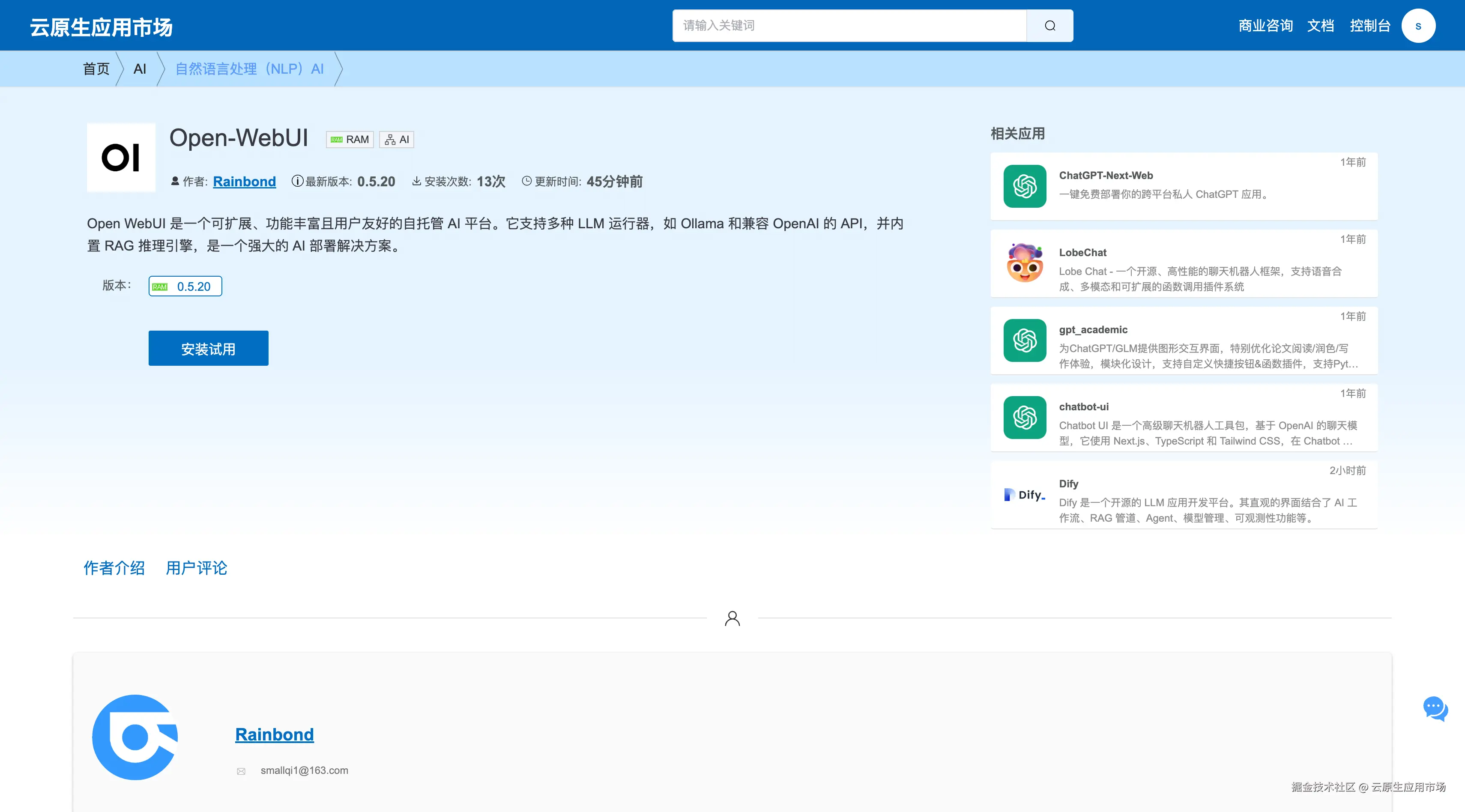 访问应用市场 **hub.grapps.cn/marketplace… Open-WebUI 应用,直接一键安装试用,整个安装过程 10 秒之内完成。应用市场里面集成了上百款开源应用,开箱即用的体验。