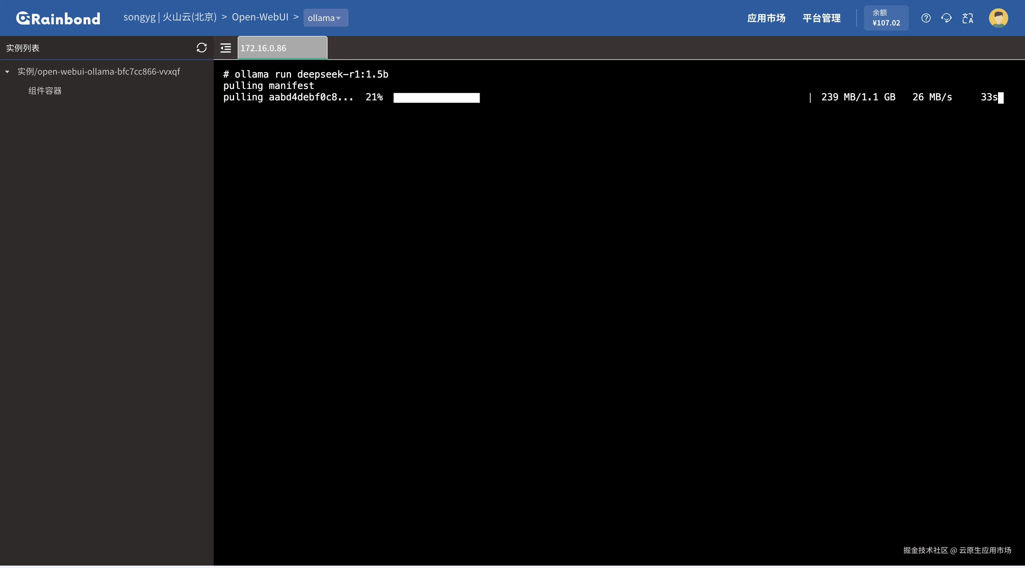 点击右上角 web 终端 执行 ollama run deepseek-r1:1.5b 命令,想下载其他模型可以访问 ollama.com/search 地址,复制命令即可。
