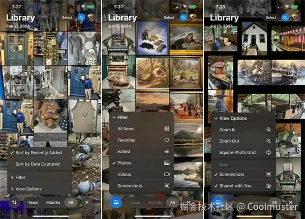 在图库中向下滑动会显示用于过滤和组织照片的新选项。您可以按“最近添加”或“拍摄日期”排序,并应用过滤器以仅显示“收藏夹”、“编辑照片”、“视频”或“屏幕截图”。