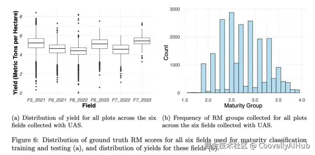 我们的数据包括1.6 - 3.9之间的地面实况RM评级。每块田的平均产量为 5.15 MTH(公吨/公顷),其中2021 F5田为0.33-8.41MTH,2021 F6田为4.55 MTH,范围为1.14-7.27 MTH,2022 F6田为4.34 MTH,范围为0.01-8.19 MTH。 2022 F6 油田为4.34 MTH,范围为0.01-8.19 MTH;2022 F7油田为4.50 MTH,范围为 1.12-6.03 MTH;2023 F6油田为5.05 MTH,范围为0.58-7.51 MTH;2023 F7油田为5.43 MTH,范围为3.26-7.30 MTH。图6显示了所有六个油田的RM评级和产量分布。