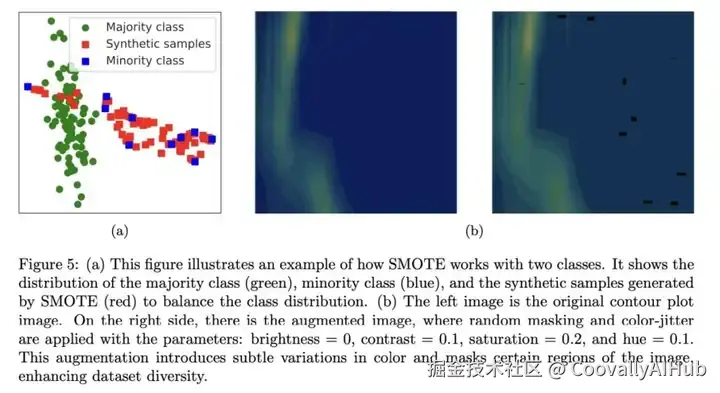 我们观察到数据中存在严重的类不平衡现象。为了解决这个问题,我们首先将数据集分成训练集、验证集和测试集,三者的比例分别为80%、10%和10%。然后,我们在训练数据集上应用标准合成数据生成技术和各种数据增强策略来解决类不平衡问题。众所周知,类不平衡会对模型性能产生不利影响,为了有效解决这一难题,我们采用了合成少数群体过度采样技术(SMOTE)。如图4所示,SMOTE是一种广泛使用的技术,它通过在现有的少数群体实例之间进行插值来生成合成实例。这一过程有助于实现均衡的类分布,加强模型训练并提高准确性。