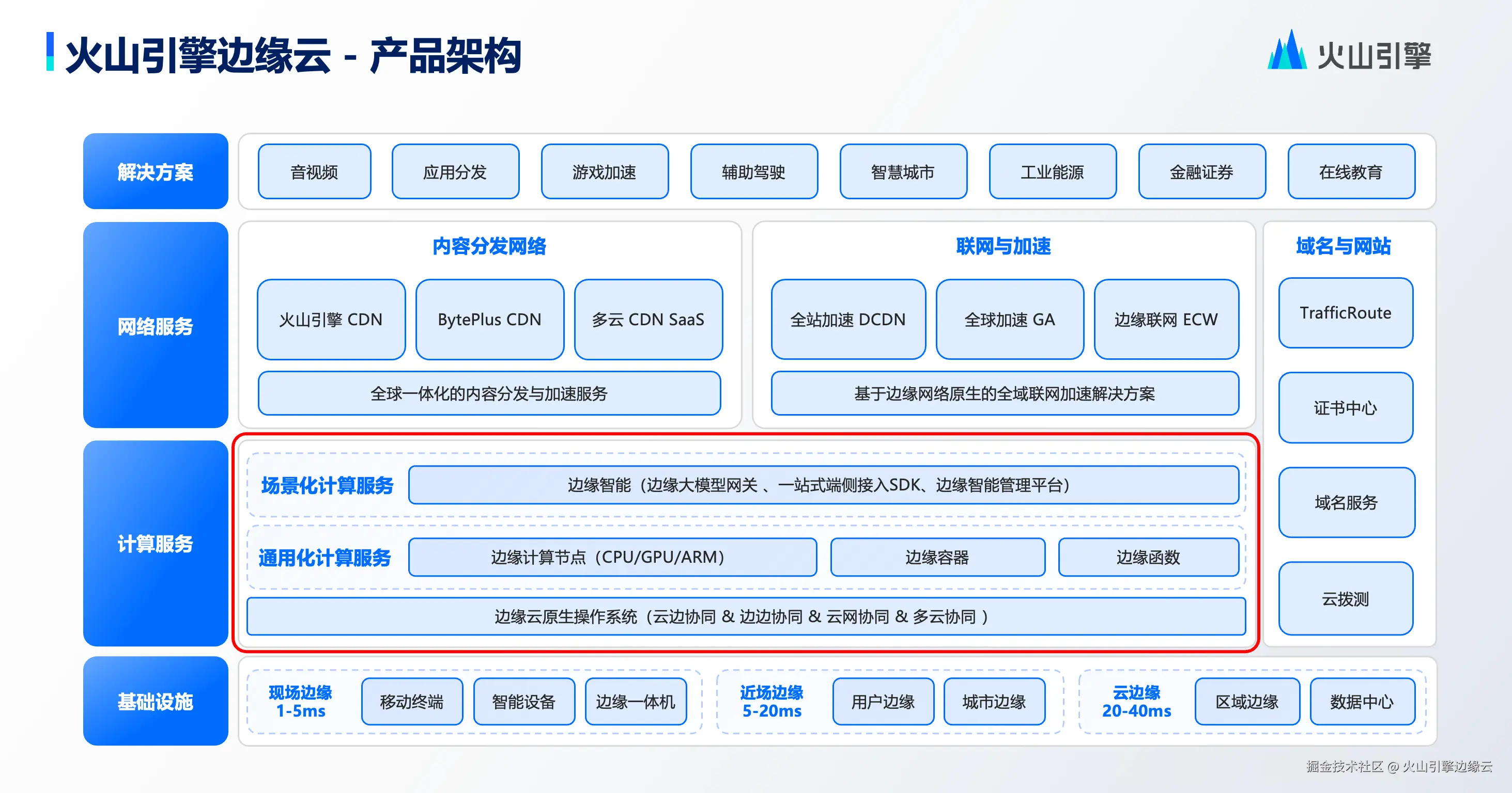 火山引擎边缘云以云原生技术为基础底座,融合异构算力和边缘网络,是构建在大规模边缘基础设施之上的云计算服务,覆盖现场边缘到云边缘,形成了以边缘位置的计算、分发、网络、存储、安全、智能为核心能力的新一代分布式云计算解决方案。