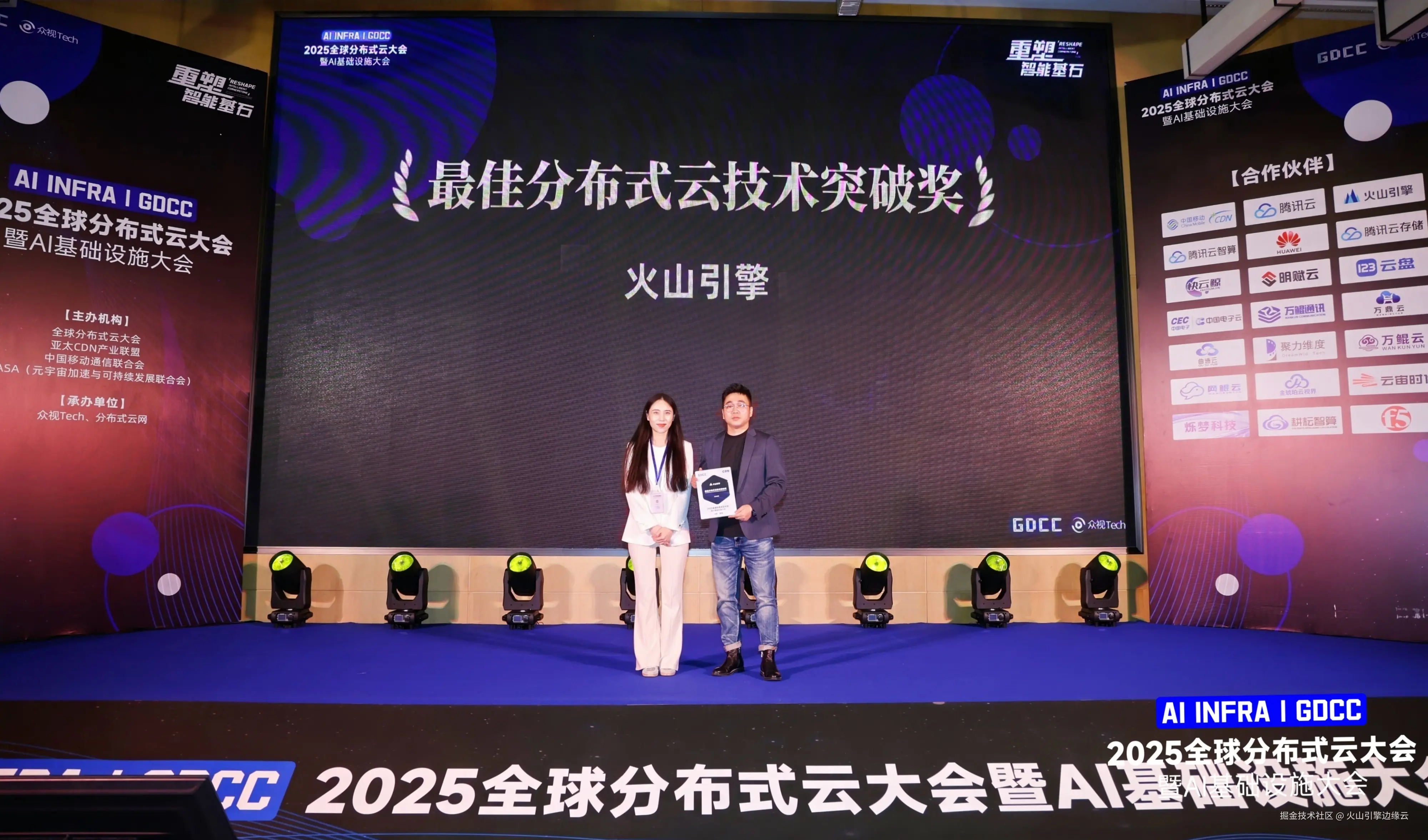 4 月 9 日,2025 全球分布式云大会暨 AI 基础设施大会在深圳成功举办,火山引擎边缘云产品解决方案高级总监沈建发出席并以《智启边缘,畅想未来:边缘计算新场景落地与 Al 趋势新畅想》为主题,分享了边缘计算在 AI 技术趋势下,对于新场景的思考与落地实践。同时,凭借在分布式云领域持续的技术积累与创新性探索,为企业数字化转型提供高可靠、低延时的基础设施与技术基座,火山引擎边缘云获得最佳分布式云技术突破奖。