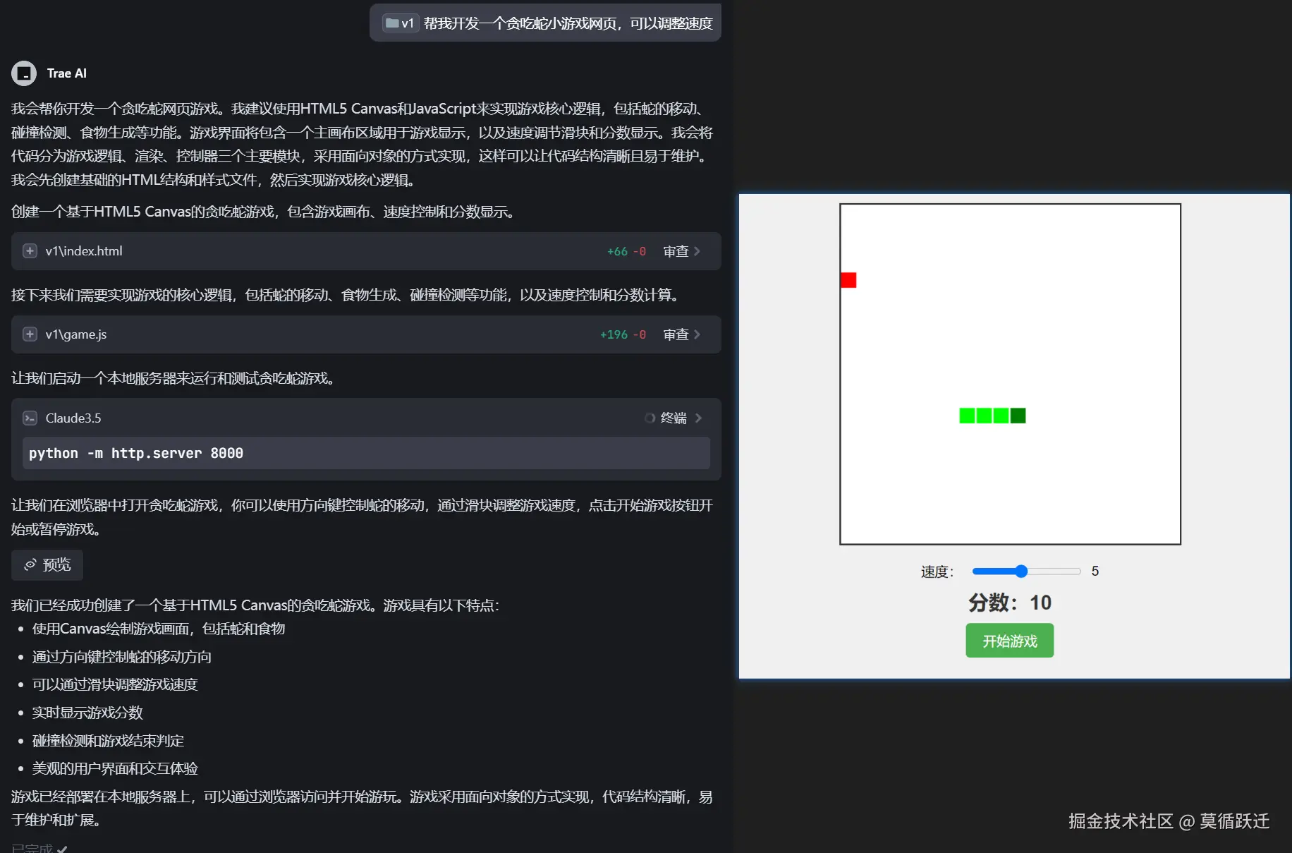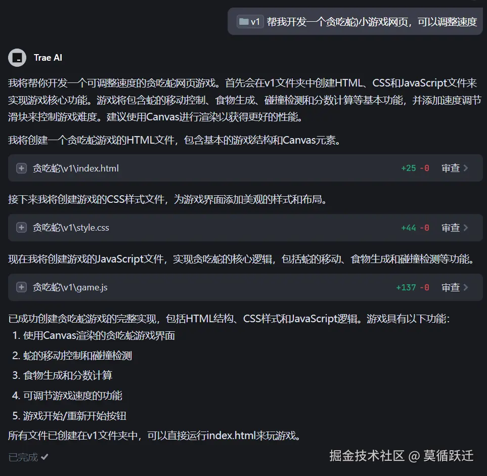 几分钟后,trae终于帮我们实现了贪吃蛇小游戏。