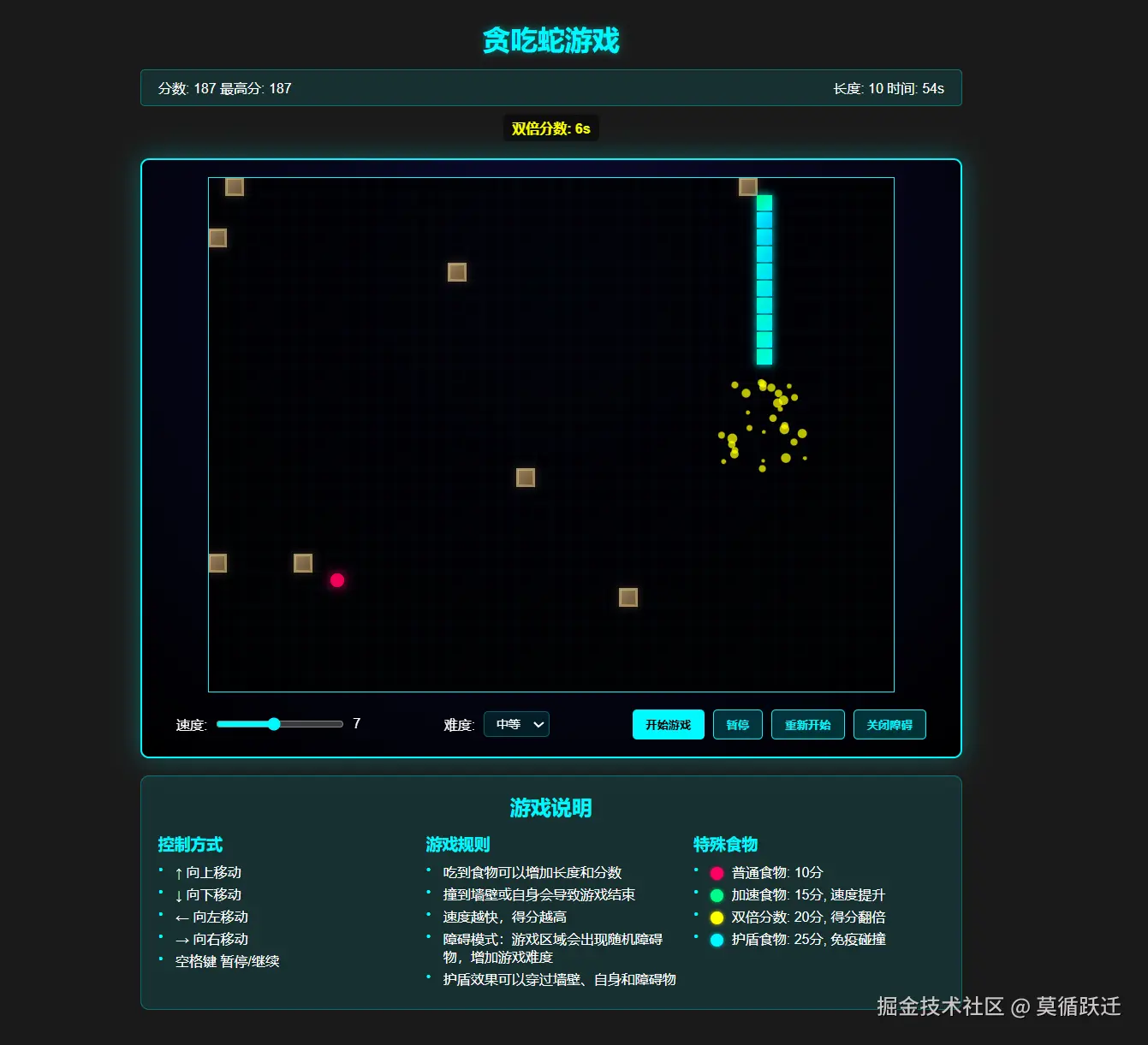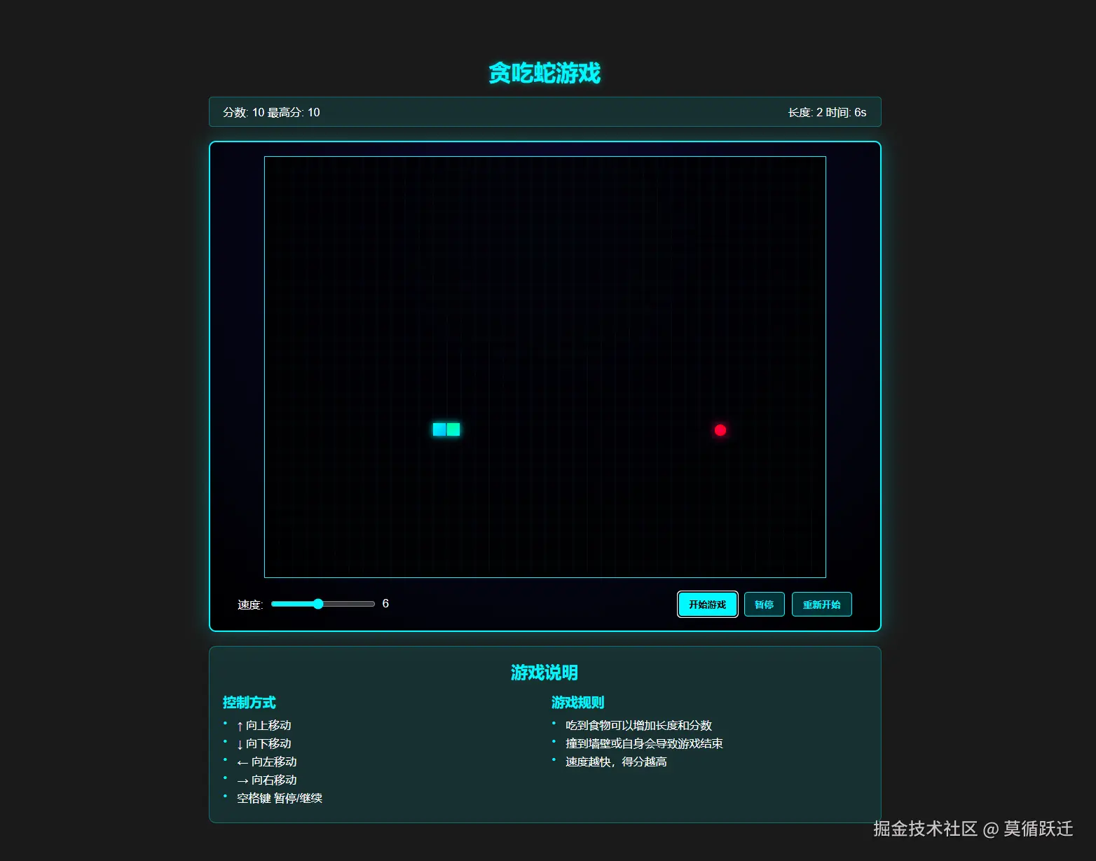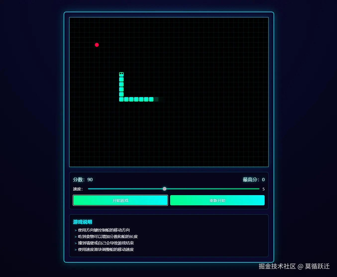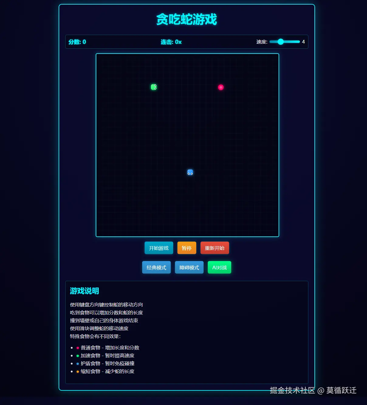 - 可以通过滑块调整蛇的移动速度(1-10级)