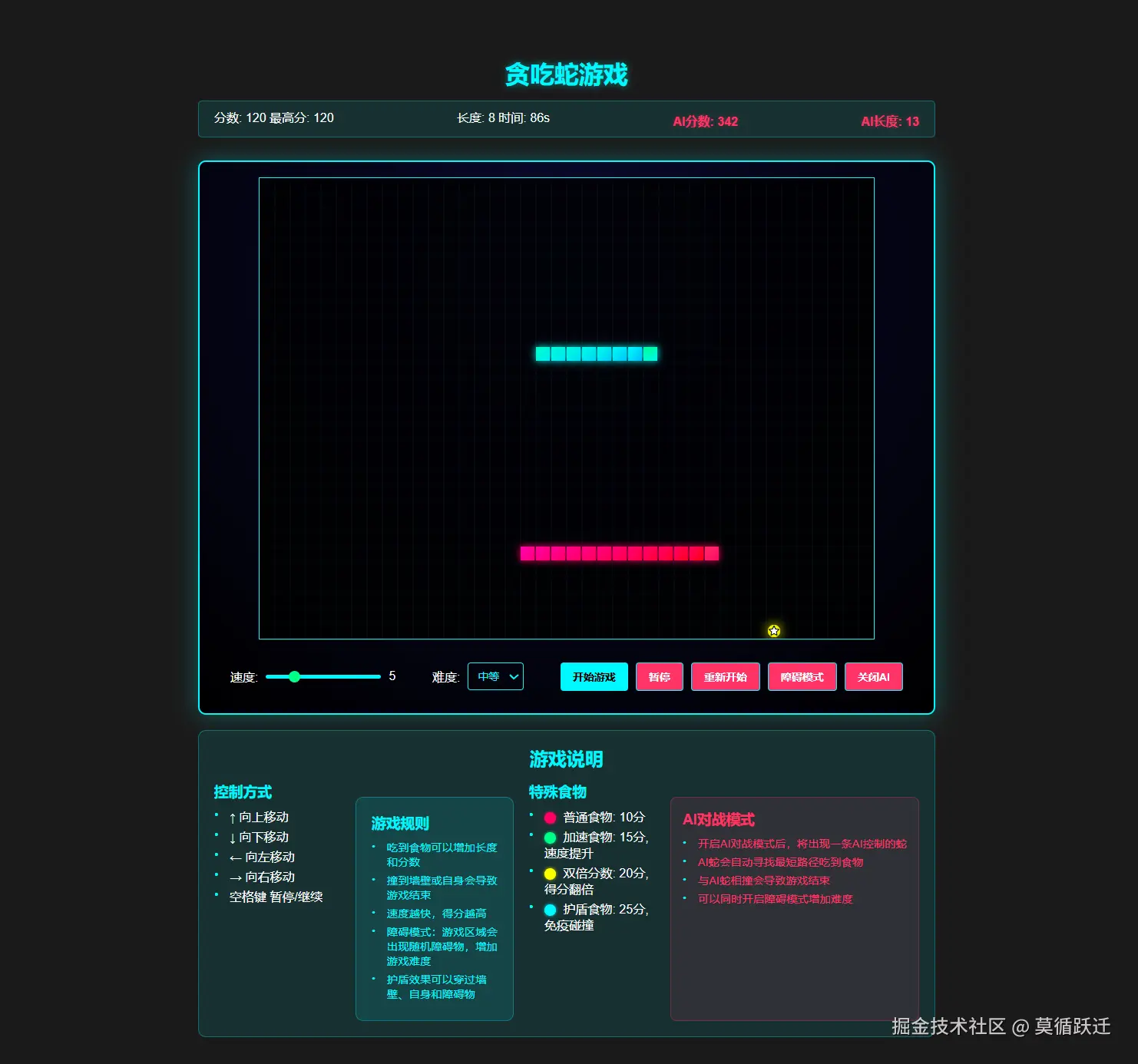 当我把文件传给Claude3.7之后,果然,相对于3.5和deepseekv3版本,Claude3.7能够更完善的理解提供的文件开发需求,不仅把样式修改,增加了吃掉食物的特效,还增加了两种新的玩法:障碍模式和AI对战模式。经过游戏体验,有点小问题,主要是AI蛇的路径规划算法有问题。