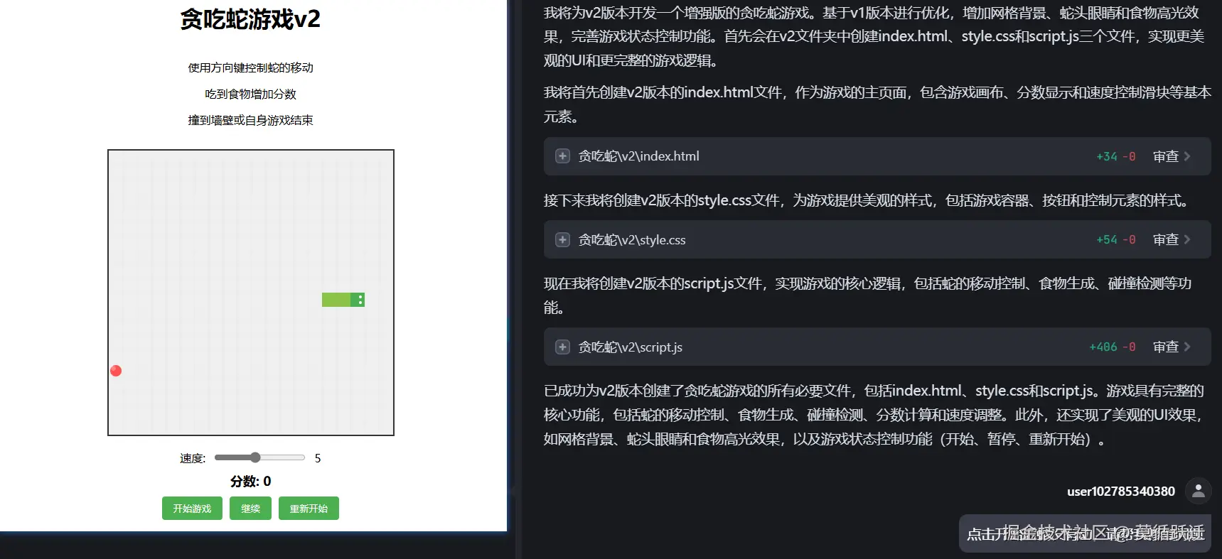 简单的提示词:帮我开发一个贪吃蛇小游戏网页,可以调整速度