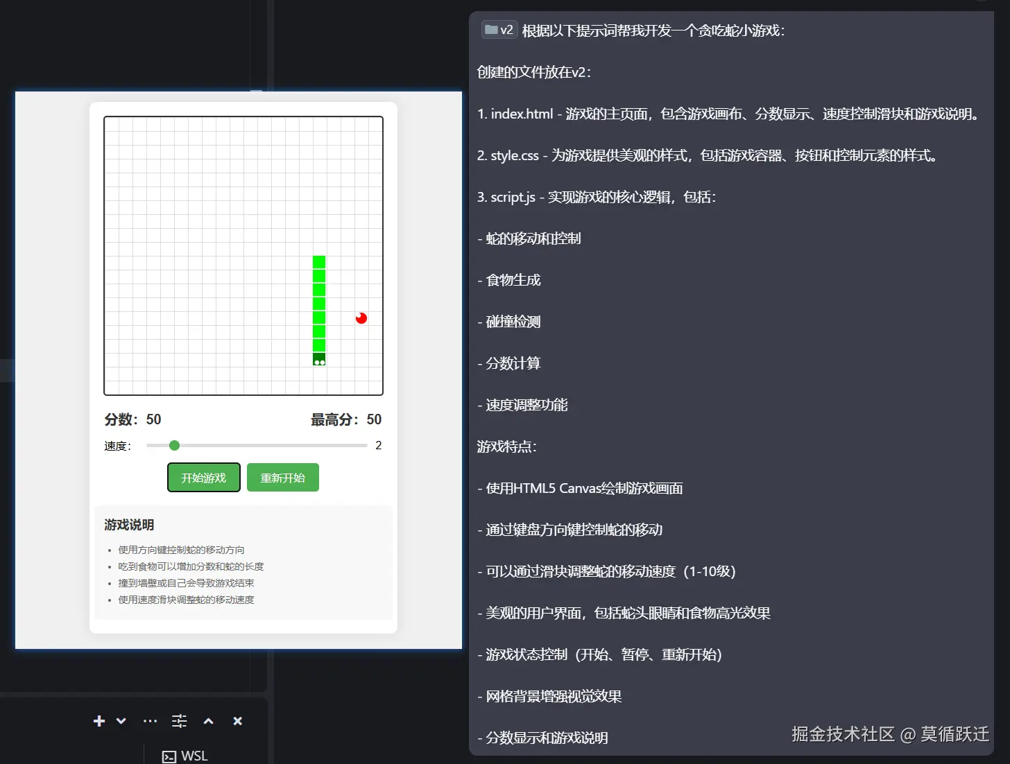 简单的提示词:帮我开发一个贪吃蛇小游戏网页,可以调整速度