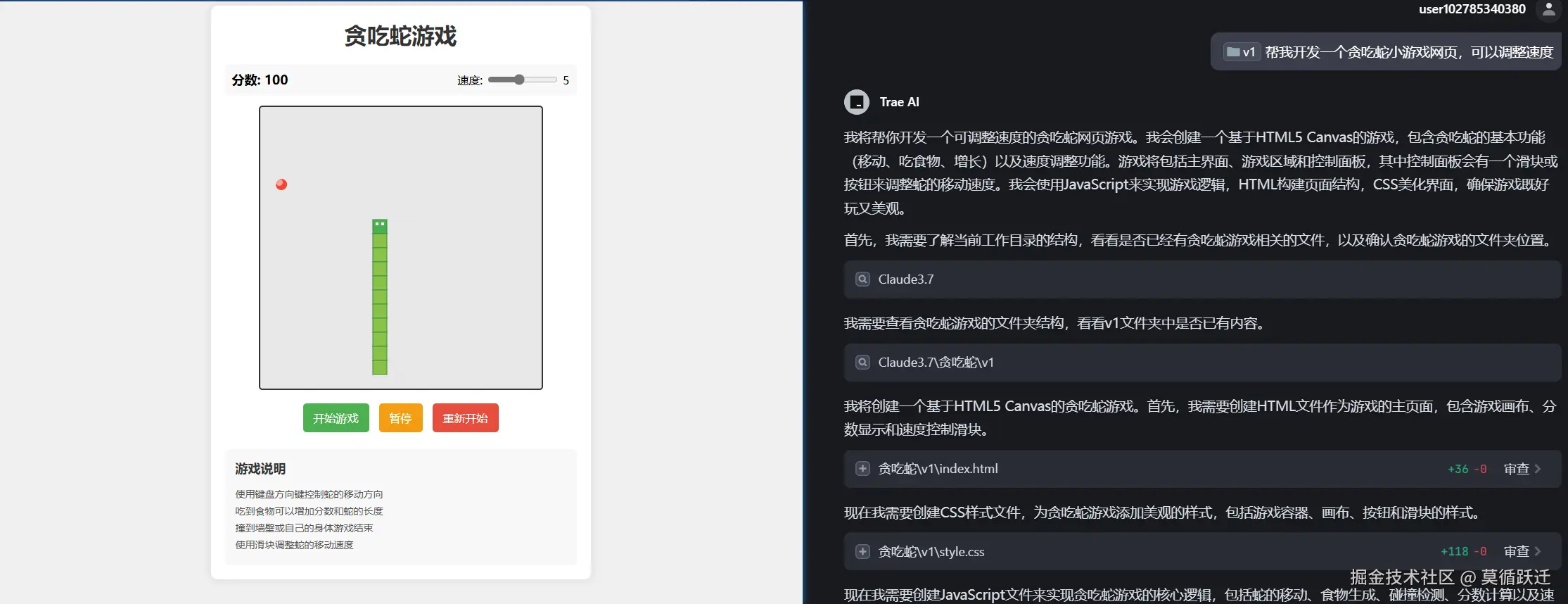 几分钟后,trae终于帮我们实现了贪吃蛇小游戏。