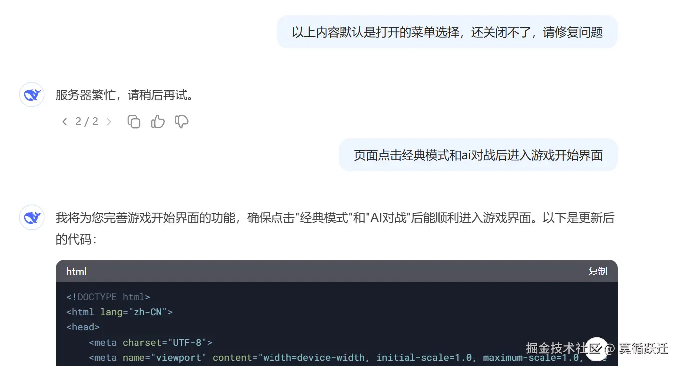 但是此时还有bug,点击普通模式和AI对战没法进入游戏界面,我发送了修复bug的提示词,经典的服务器繁忙,😂。不过这次给出的代码以及可以进入游戏界面