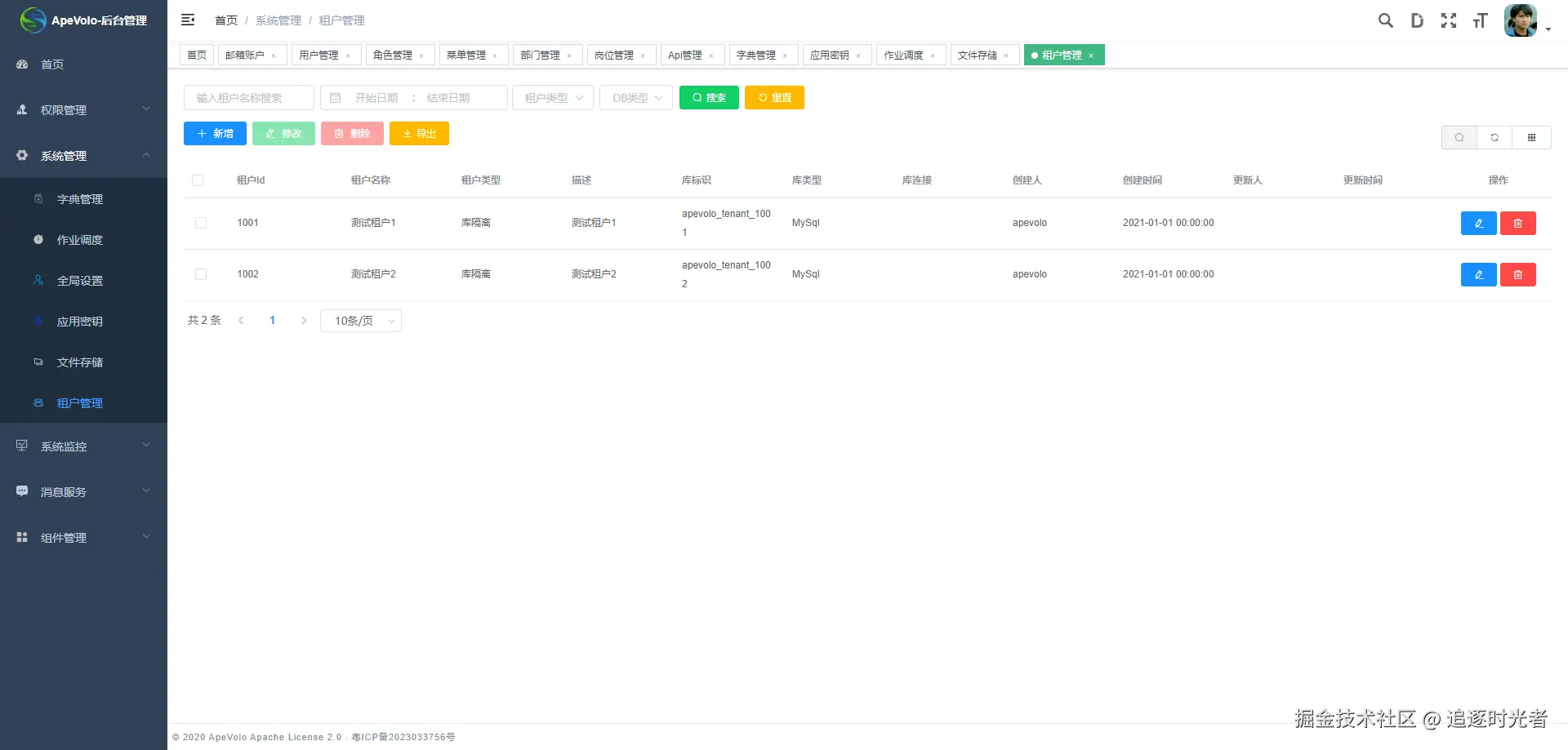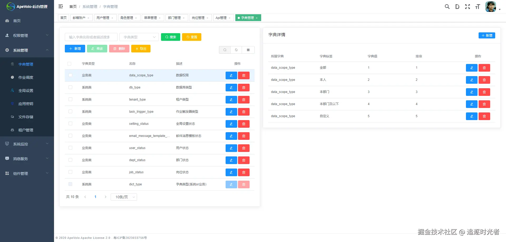 - 系统管理: 字典管理、作业调度、全局设置、文件存储、租户管理等。