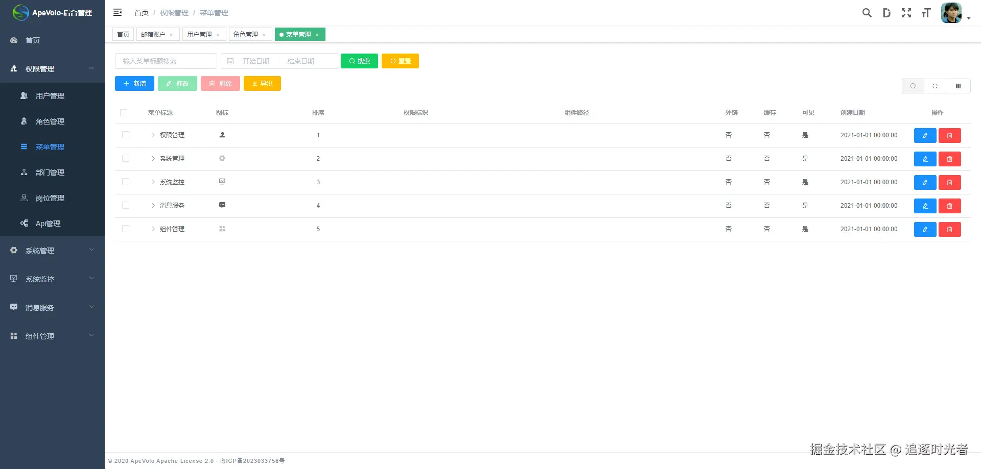 - 权限管理: 用户管理、角色管理、菜单管理、部门管理、岗位管理、API管理。