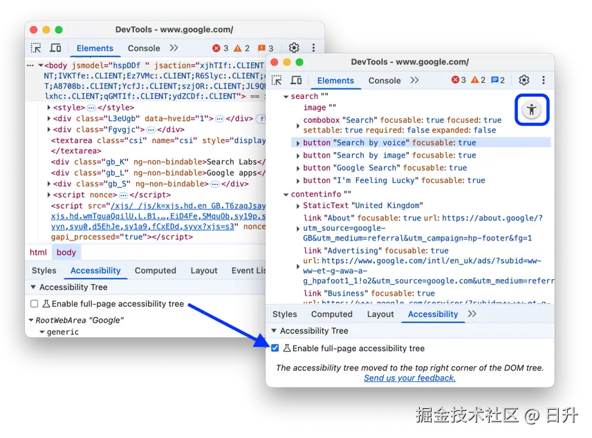 启用默认的辅助功能树视图前后的界面差异也被展示了出来