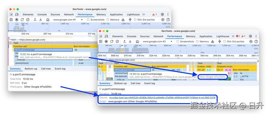 Performance > Summary(性能 > 概览)选项卡现在会显示配置分析(profile)和函数调用相关的脚本及来源链接,这样就不需要再将鼠标悬停在 Main 轨道上的事件上来查看这些信息了。