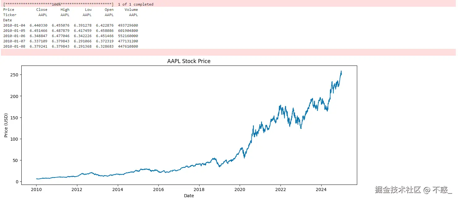 我们使用yfinance库获取苹果公司2010-2025年的历史数据。选择收盘价(Close)作为核心指标,因为它反映每日交易最终共识。