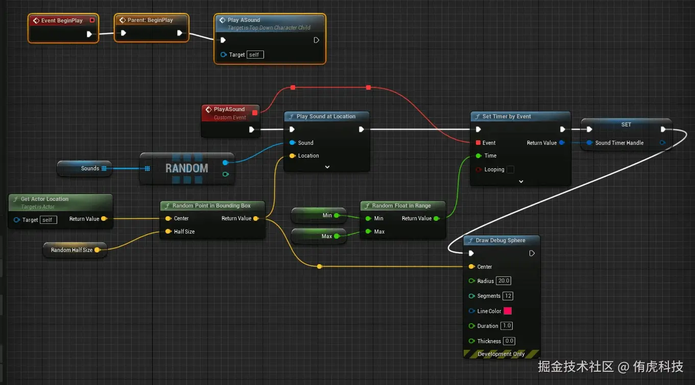 可以用Draw Debug Sphere来显示当前随机的Location,用au.Debug.SoundCues 1来显示音频文件: