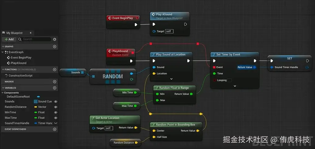 A:参考以下蓝图,核心就是Play Sound at Location,将Sounds设置为Array从中随机获取,Location也是设置包围盒在里面随机取。另外用Set Timer by Event来持续调用这个事件。