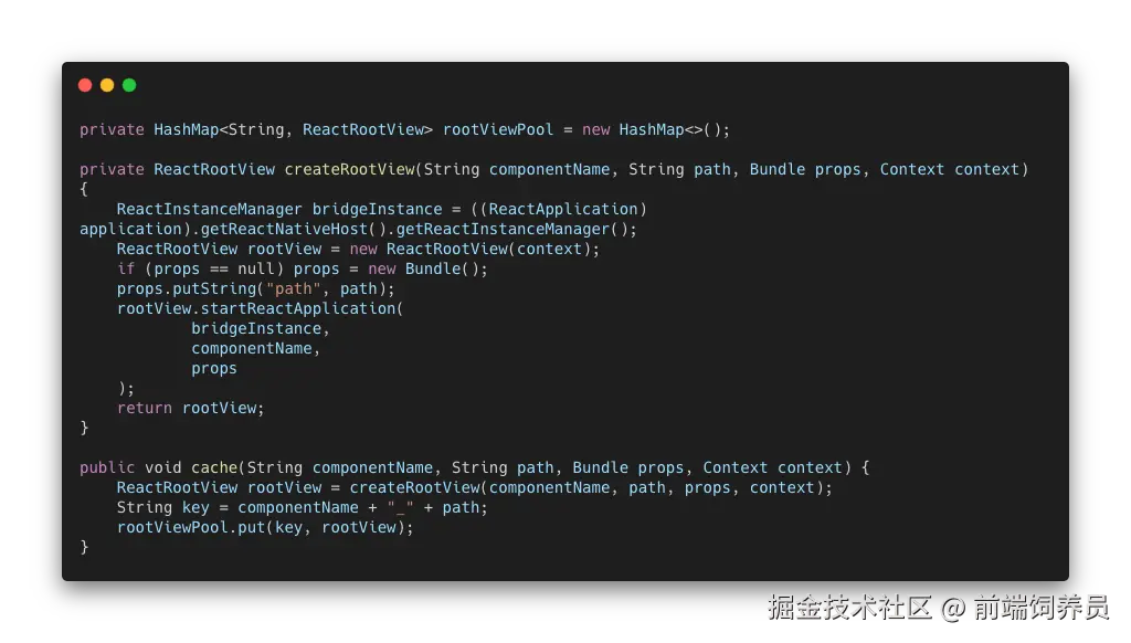 接下来我们需要定义一个预渲染视图的管理类,这个类提供一个预加载的 API cache() 方法,接收要预渲染视图的 componentName 以及页面初始化时的 props。在获取到这些信息之后我们就可以创建根视图,并将已经初始化的 Bridge 实例、componentName 以及其他的页面信息作为参数,传入根视图调用 runApplication() 方法,开始触发 JavaScript 端的渲染流程。