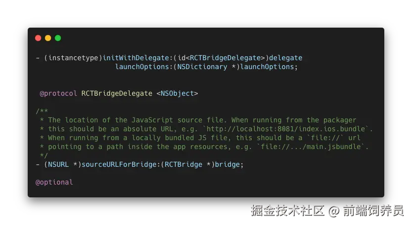 在 iOS 端,需要开发者创建一个代理实例设置好 JSBundle 的资源路径,然后调用-initWithDelegate: launchOptions:方法将代理类和启动配置传入,就可以构造出一个 RCTBridge 实例,触发初始化流程。这个实例需要开发者自己用变量存下来,以便后续创建根视图时使用;