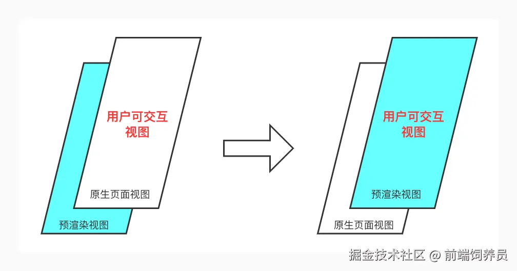 而在使用预渲染视图阶段,当用户交互触发页面跳转的时候,到缓存池中取出预加载的根视图,然后更新根视图的 props,触发 JS 端更新渲染流程,最后设置根视图为内容视图,展示给用户。