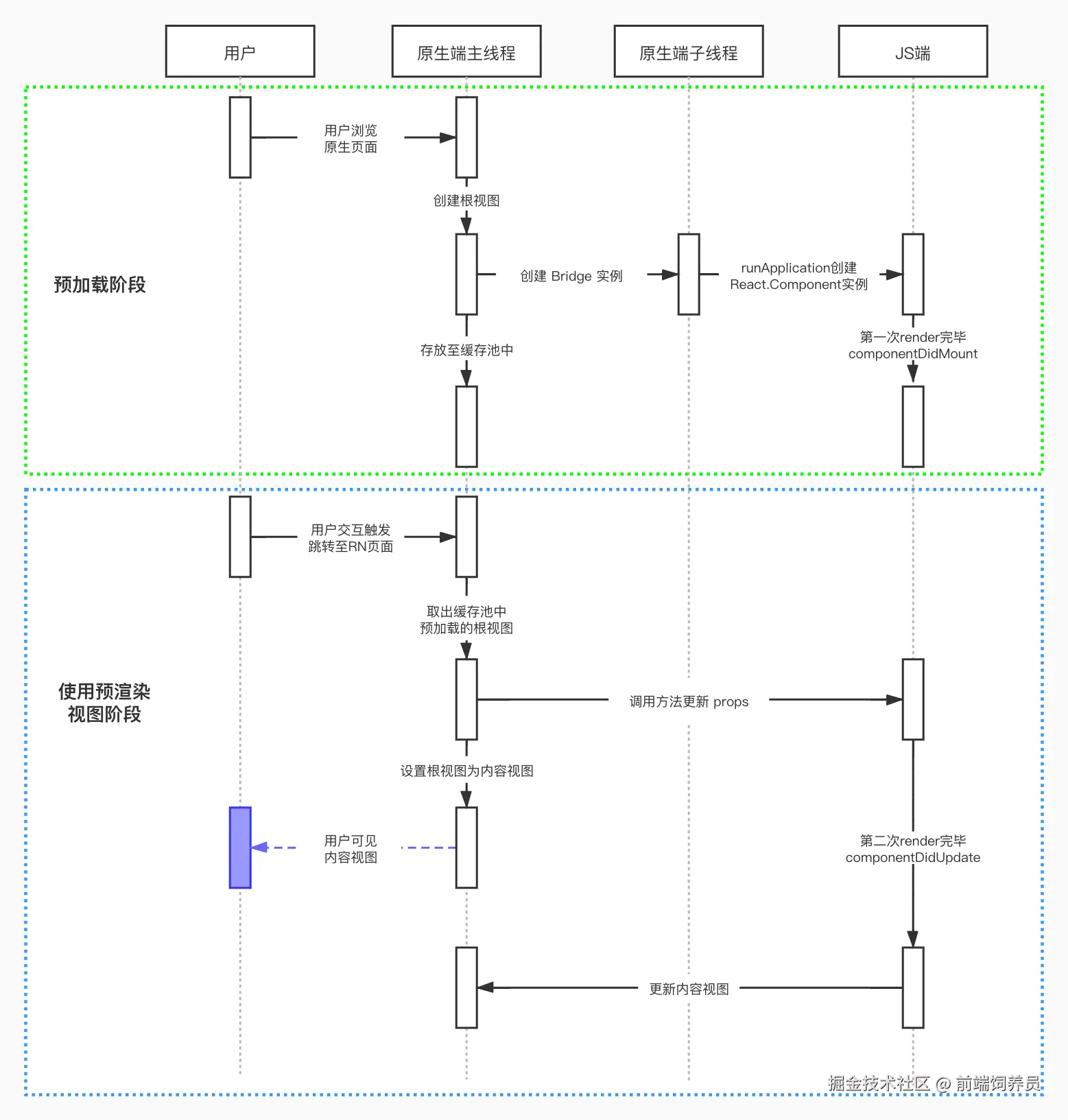 你可以看到,在预加载阶段,当用户浏览原生页面的时候,我们就提前创建好 React Native 页面的根视图。然后触发 Bridge 实例的初始化流程、触发 JS 端渲染流程,再将根视图存放在缓存池中。