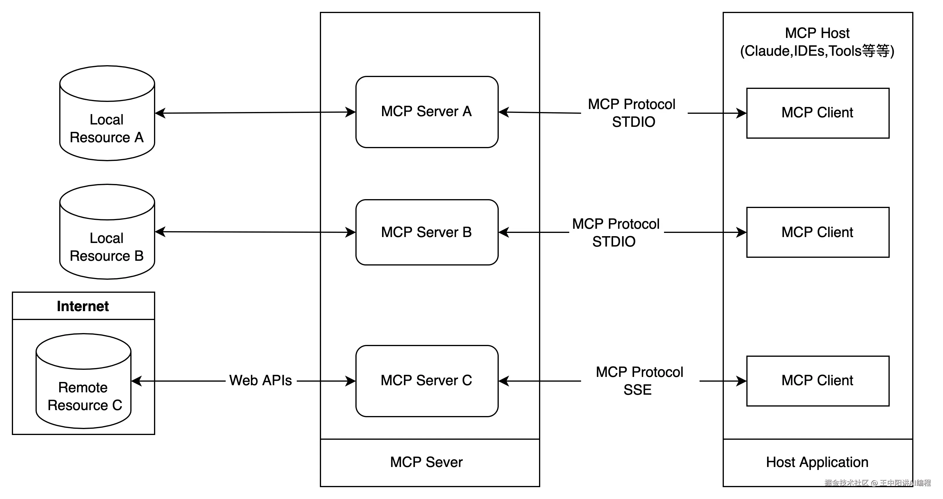 MCP的核心是“客户端-服务器”架构,其中MCP客户端可以连接到多个服务器。客户端是指希望通过MCP访问数据的应用程序,如CLI工具、IDE插件或AI应用。