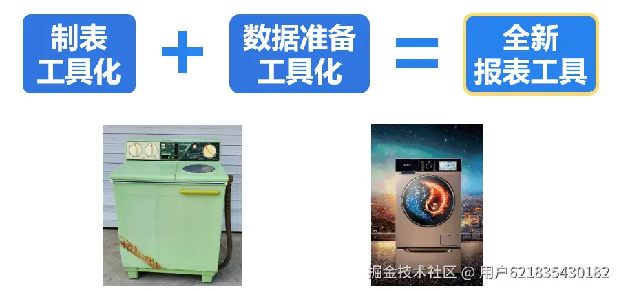就像我们总得洗衣服,这也是一件没完没了的事情,有了半自动洗衣机后会轻松一些,但人工成本还是要付出挺多(只有报表工具就相当于是半自动洗衣机,做报表有工具了,但是数据准备还得人工去写),用全自动洗衣机后,人工成本的投入才能大幅度降下来