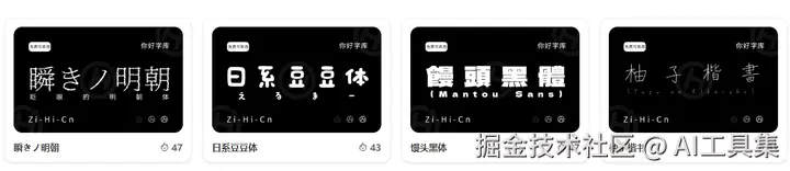你好字库(Zi.Hi.Cn)就是这样一个宝藏平台,为我们提供免费可商用字体、高品质字体资源。这里的 4 款日文字体,无论是在传统的设计领域,还是在现代的数字世界中,都有着各自独特的应用价值。它们不仅丰富了我们的字体选择,更为我们的创作提供了更多的灵感和可能。无论是追求复古优雅、可爱俏皮,还是简洁现代、温暖手写的风格,都能在这 4 款字体中找到满意的答案。找字体,就来你好字库!