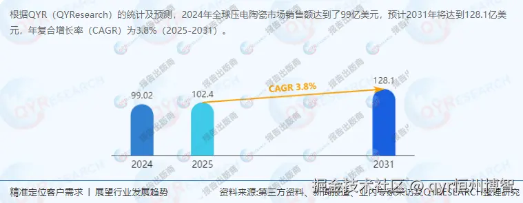 市场规模:根据QYResearch最新调研报告显示,2024年,全球压电陶瓷市场销售额达到了99亿美元,预计2031年将达到128.1亿美元,年复合增长率(CAGR)为3.8%(2025-2031)。中国市场在过去几年变化较快,尽管具体数值未给出,但基于中国在全球制造业与消费电子领域的领先地位,其市场规模亦呈快速增长态势。