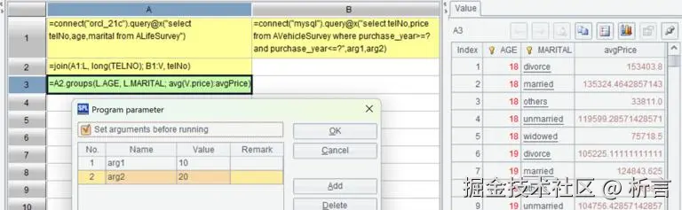 用参数过滤 MySQL 的车险调查表,再通过电话号码与 Oracle 的寿险调查表进行内关联,按寿险调查表的年龄、婚姻状态分组,统计该组人群在车险调查表里的平均购车价格。