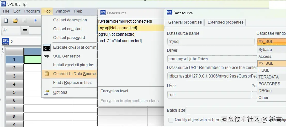 打开 esProc IDE,找到菜单 "Tool->Connect to Data Source",新建 JDBC 数据源,填入 MySQL 和 Oracle 的连接信息。