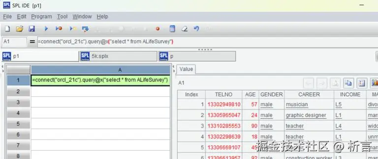 可以看到,Java 调用 SPL 代码的过程和调用 SQL 代码一样。运行后可以看到结果: