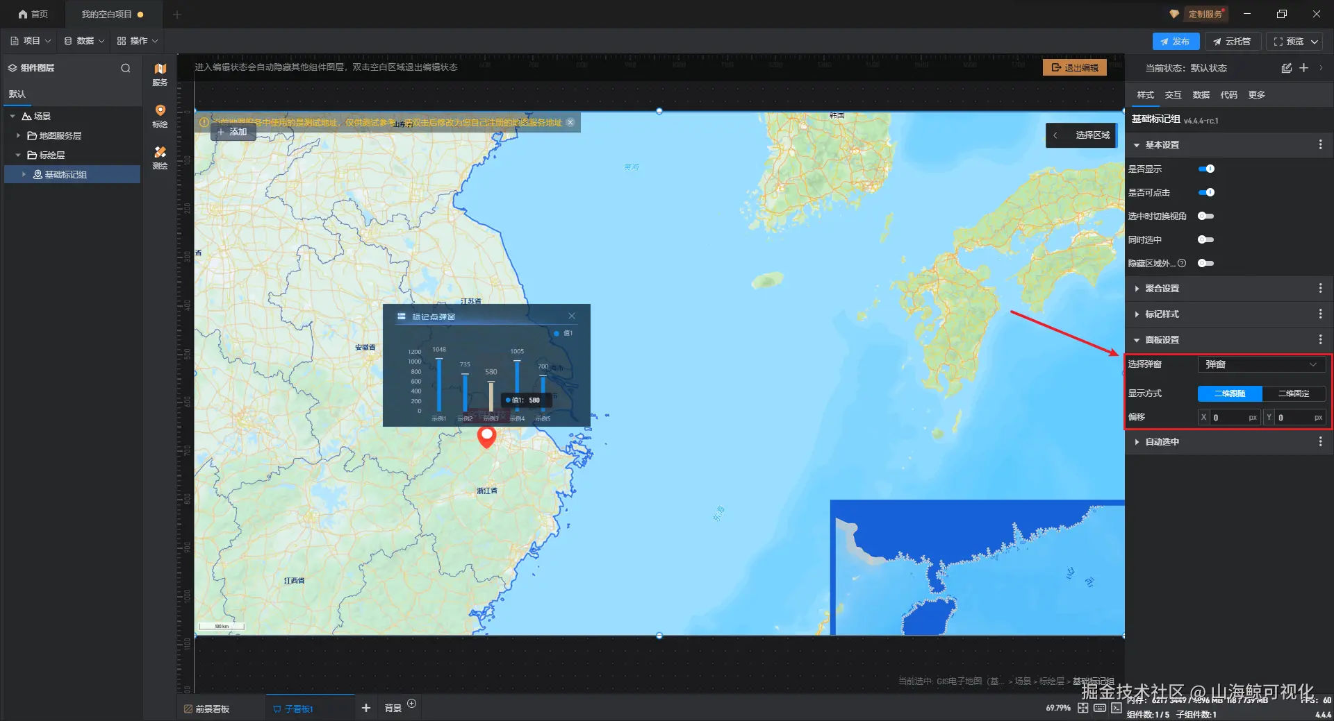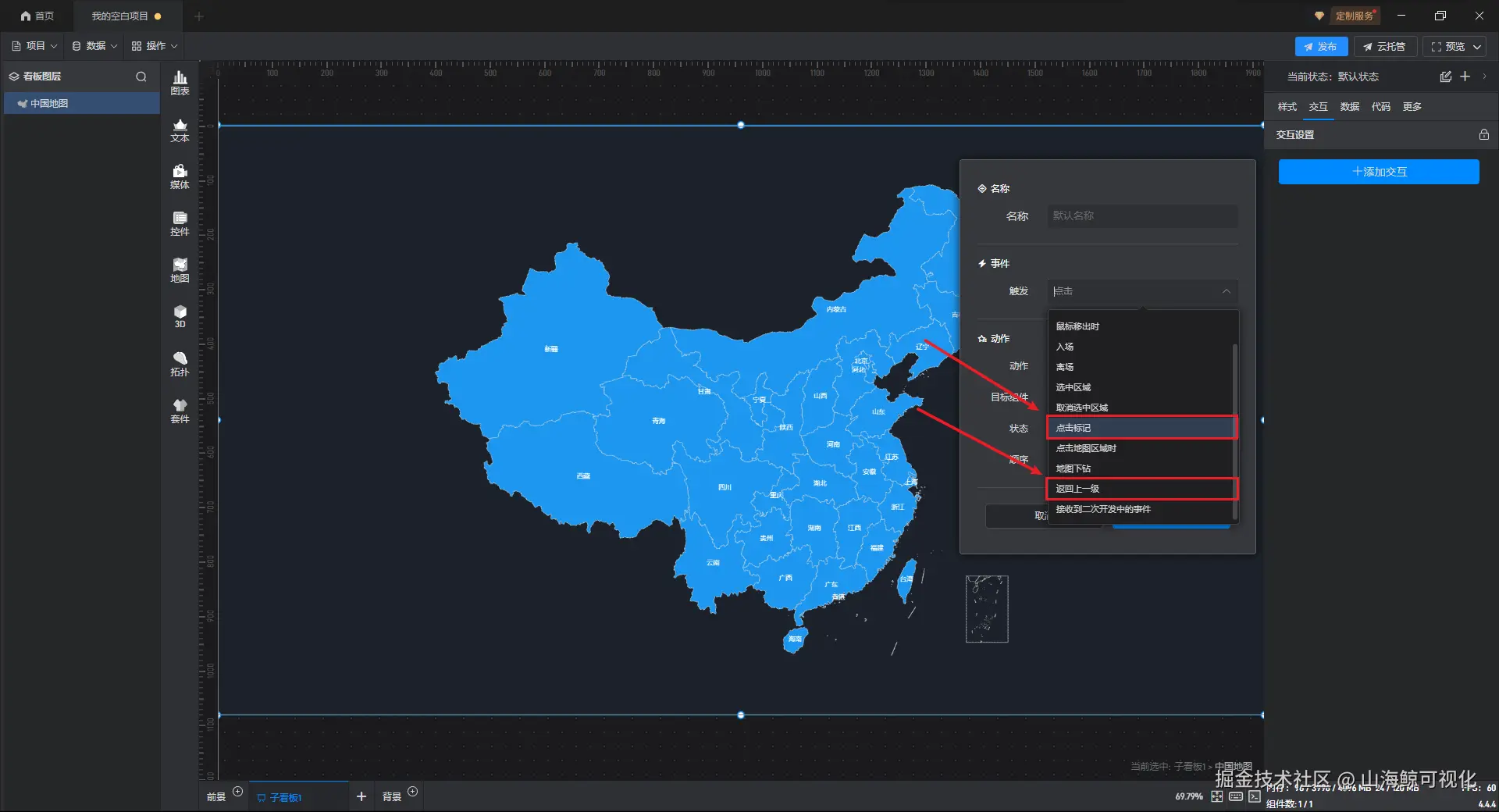 在山海鲸可视化4.4.4版本软件更新中,为了进一步方便大家的使用,山海鲸可视化在二维中国地图组件中,新增了标记点击的交互、标记显示隐藏的交互、返回上一级的交互。
