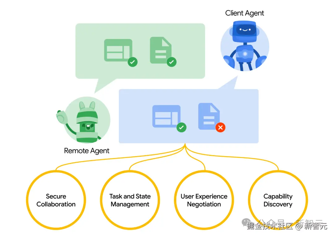 客户端智能体负责制定和传达任务,而远程智能体则负责执行这些任务,尽量提供正确的信息或采取正确的行动。这个互动涉及几个关键功能: