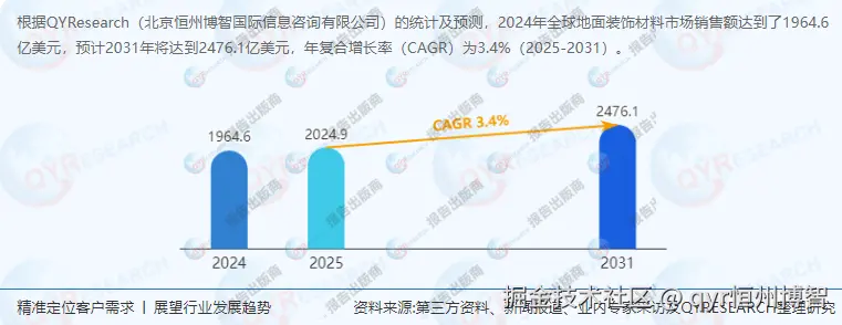 市场规模:根据QYResearch最新调研报告显示,2024年,全球地面装饰材料市场销售额达到了1964.6亿美元,预计2031年将达到2476.1亿美元,年复合增长率(CAGR)为3.4%(2025-2031)。