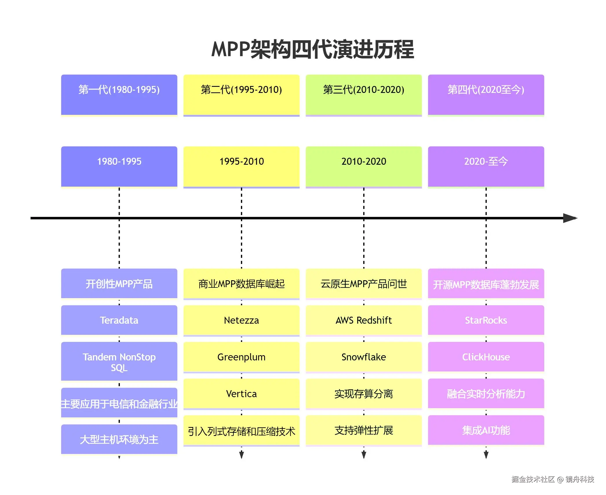 - 第四代(2020 至今) :以 StarRocks、ClickHouse 为代表的开源 MPP 数据库蓬勃发展,融合实时分析与 AI 能力