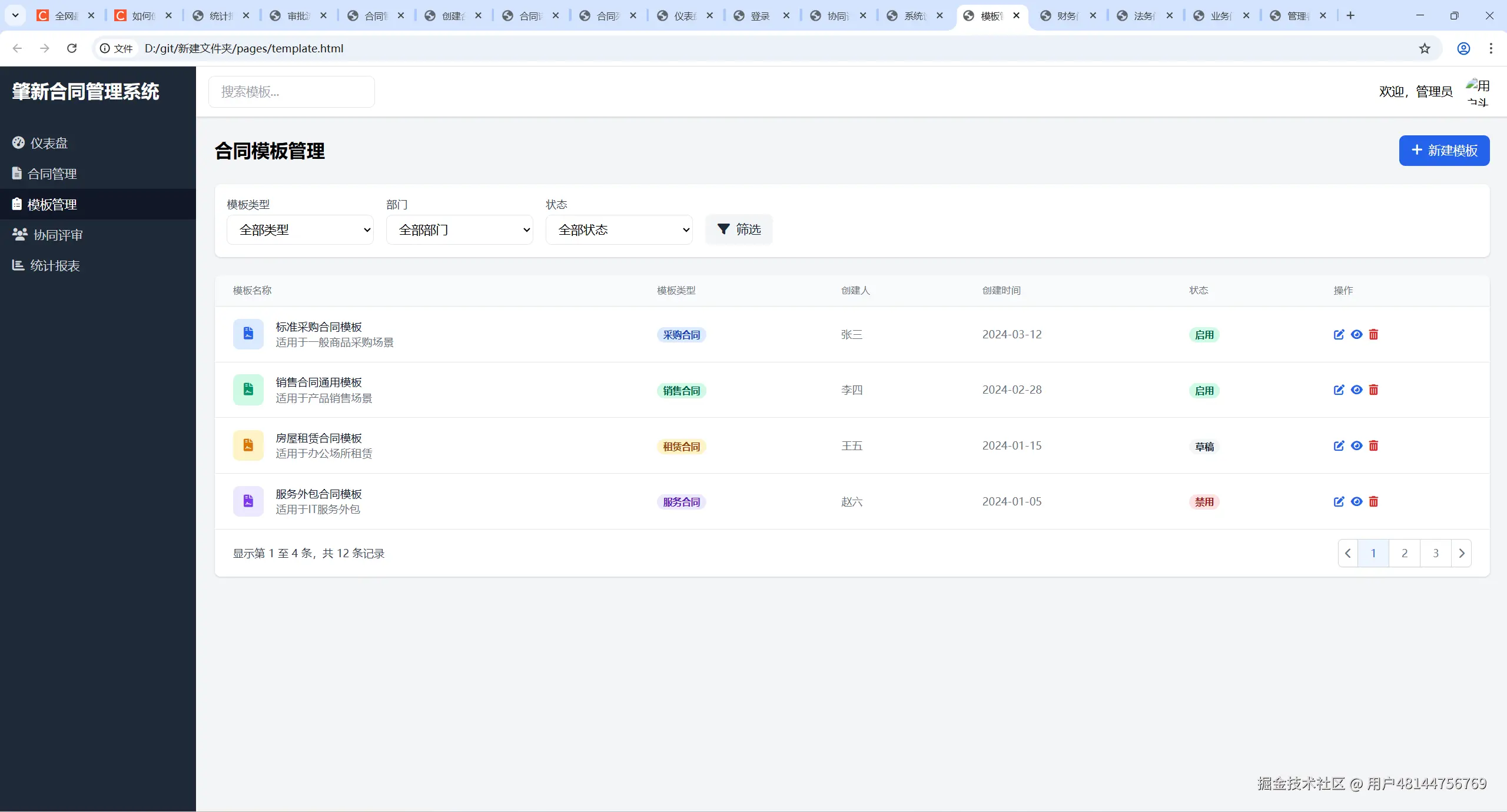 Cursor还贴心地生成了一个index.html作为预览入口。我右键选择"在浏览器中打开",然后...我的下巴都要惊掉了!一个完整的、可交互的合同管理系统原型就这样出现在我面前!