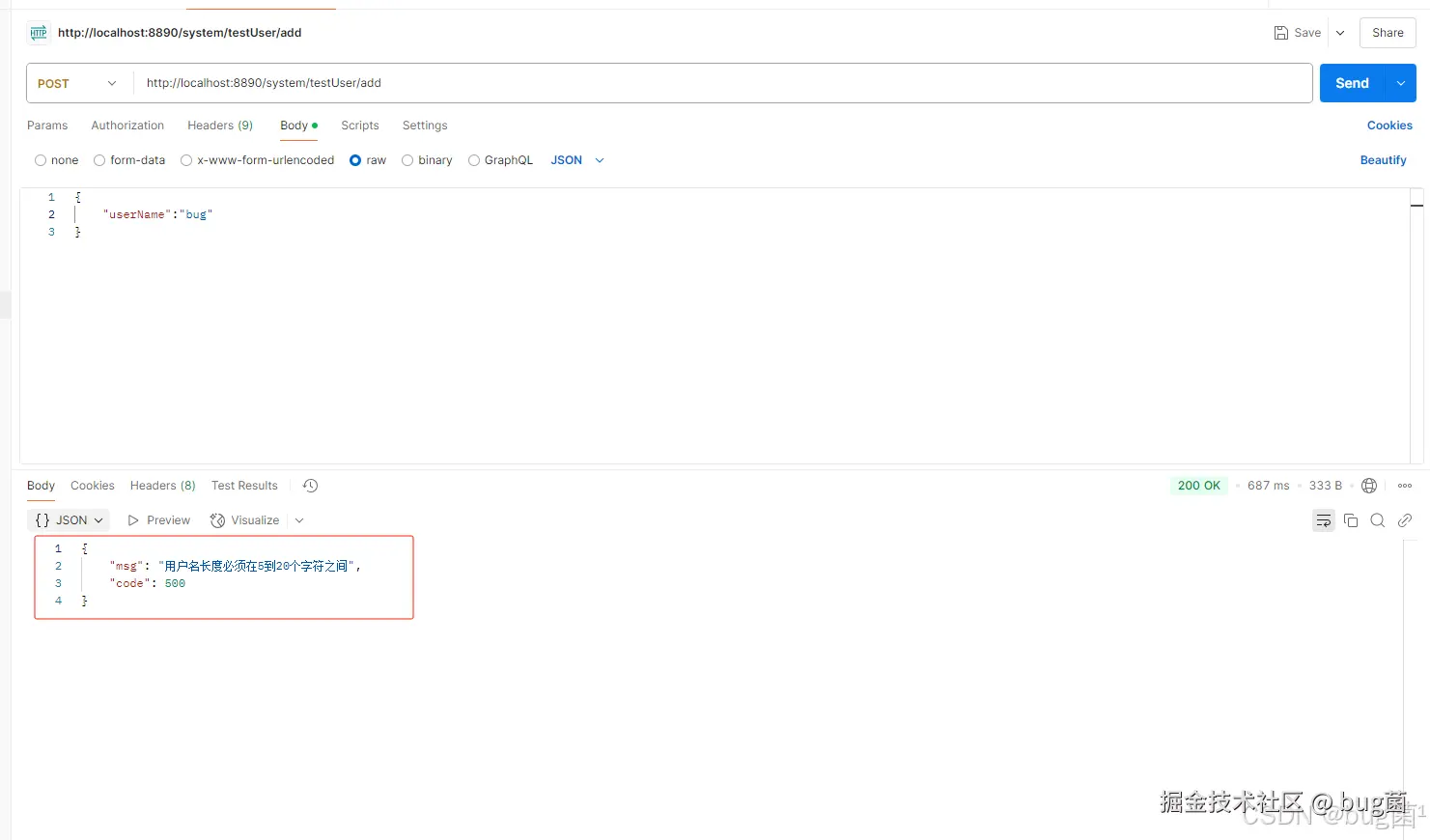 在这个例子中,userName 字段的长度限制在 5 到 20 个字符之间,passWord 字段在 8 到 16 个字符之间。如果数据不符合要求,Spring 会返回我们设置的自定义错误提示信息。