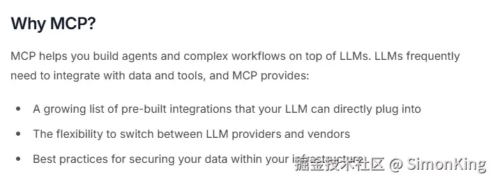 MCP帮助在 LLM 之上构建代理和复杂工作流程,LLM 可通过 MCP 直接插入众多预构建集成,具有在不同 LLM 提供商和供应商之间切换的灵活性,并提供保护数据的最佳实践。 -