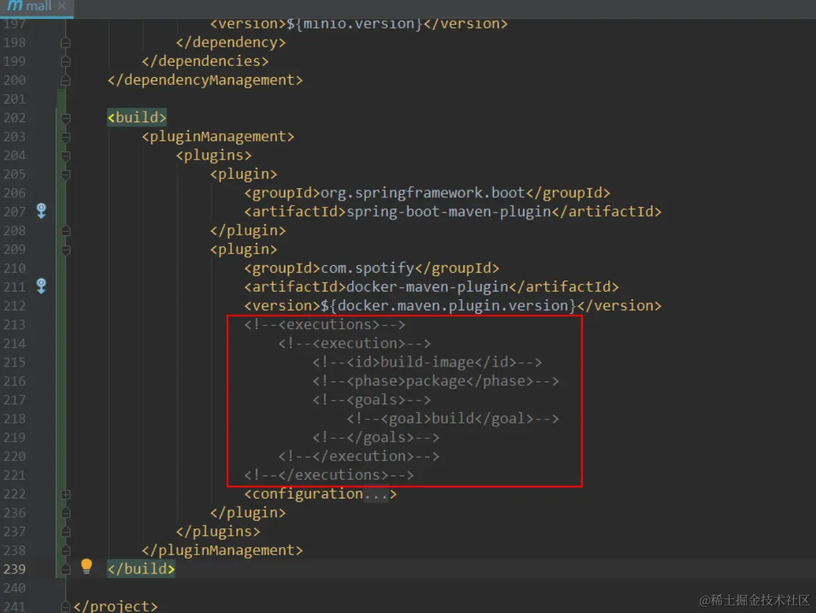 如果项目根目录的pom.mxl中docker-maven-plugin的<executions>节点被注释掉了就打开注释,使项目在打包时直接构建Docker镜像;