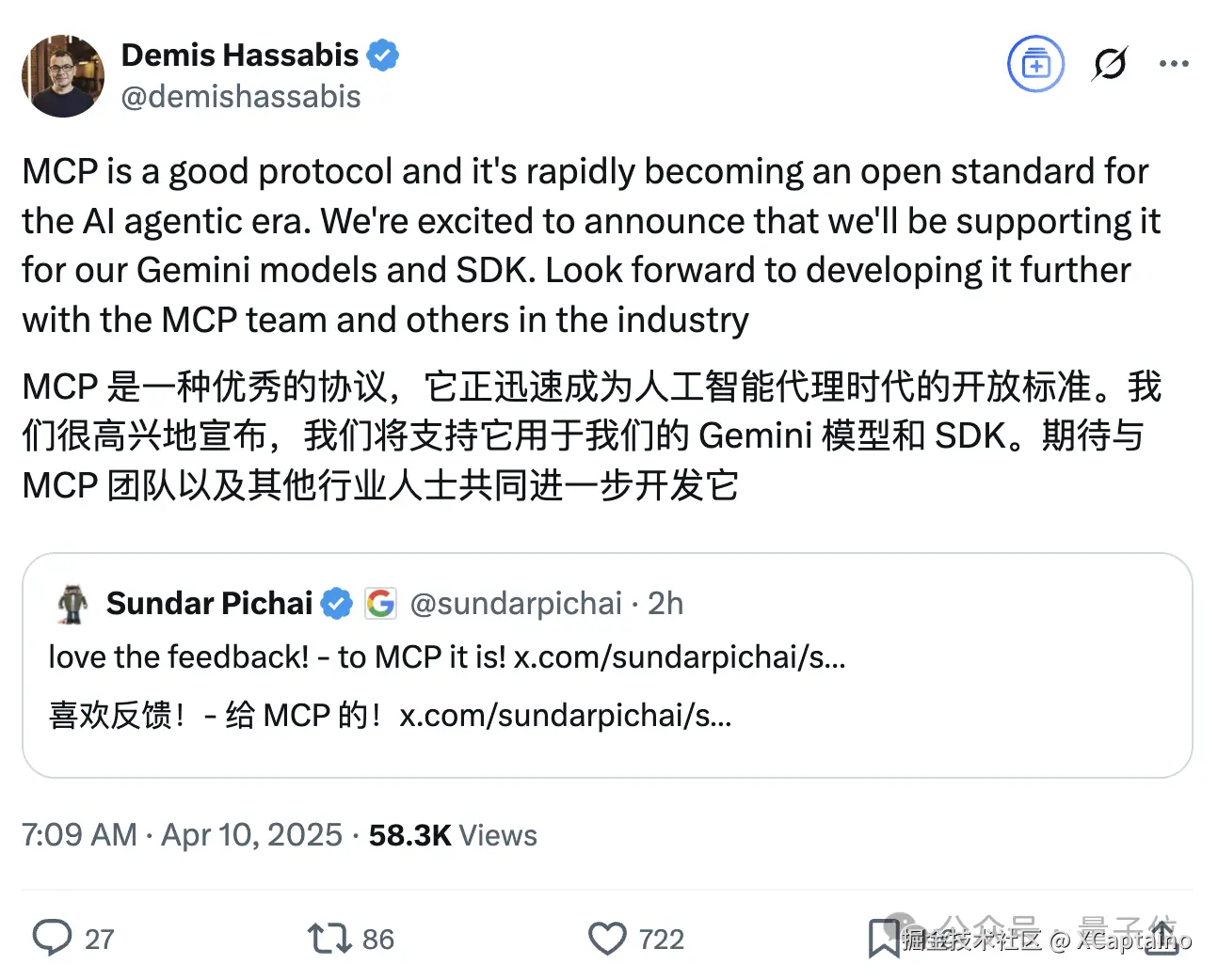 MCP是一个出色的协议,并且它正迅速成为AI Agent时代的一项开放标准。我们非常高兴地宣布,我们将为自家的 Gemini模型和SDK提供对该协议的支持。期待能与MCP团队以及行业内的其他各方进一步共同开发完善该协议。