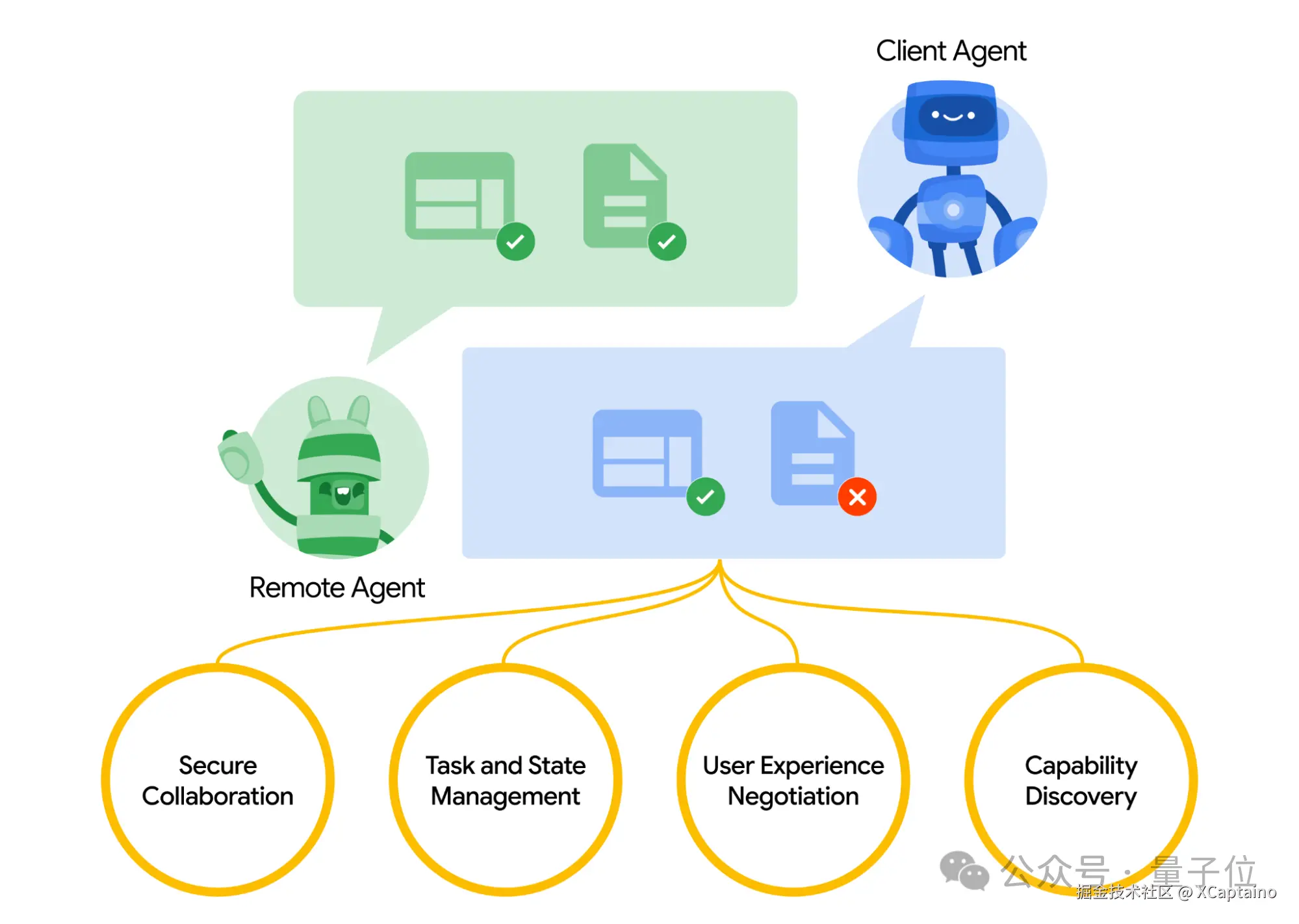 “客户端”Agent与“远程”Agent之间进行通信,客户端Agent负责制定和传达任务,远程Agent则负责执行这些任务,或是提供正确信息,或是采取正确行动。