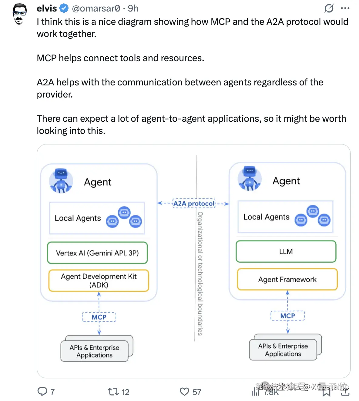 A2A发布后网友们也将其与MCP进行了比较,看下面这张图就更明了了: