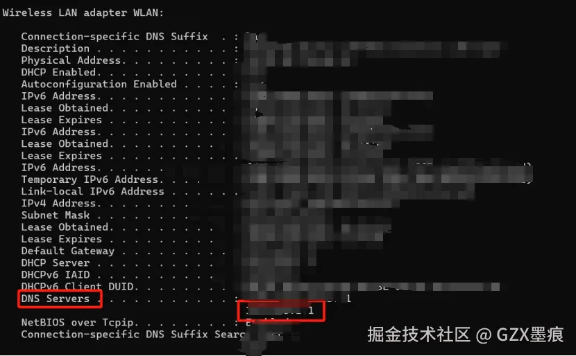 通过指令”ipconfig /all”获取DNS服务器: