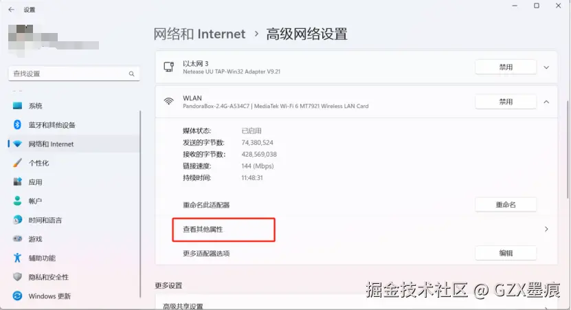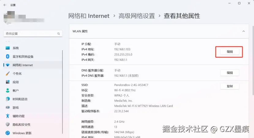 在设置中找到“网络和Internet”,依次点击“高级网络设置 -> WLAN -> 查看其他属性 ”在IP分配处点击“编辑”: