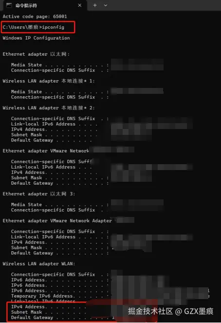 然后在命令行窗口输入”ipconfig”命令查看ip地址、子网掩码和默认网关: