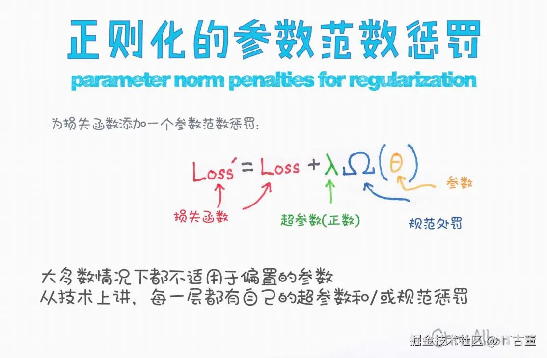 在原始损失函数 Loss 的基础上,添加一项额外的惩罚(penalty),防止参数(weights)过大,从而控制模型复杂度,提升泛化能力。