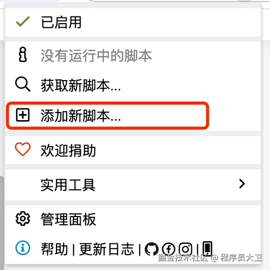 2.安装完成后,点击浏览器插件图标,选择“添加新脚本”,就可以开始编写你的第一个脚本: