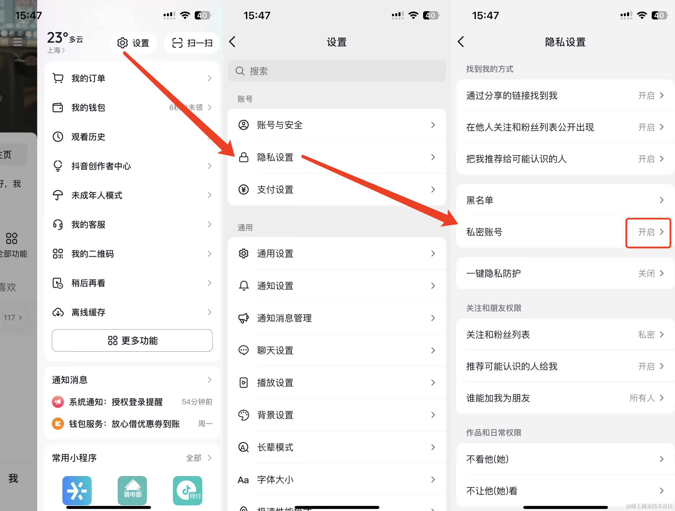 1.抖音端首先设置为私密账号:抖音 - 我 - 右上角更多 - 设置 - 隐私设置 - 私密账号 - 开启