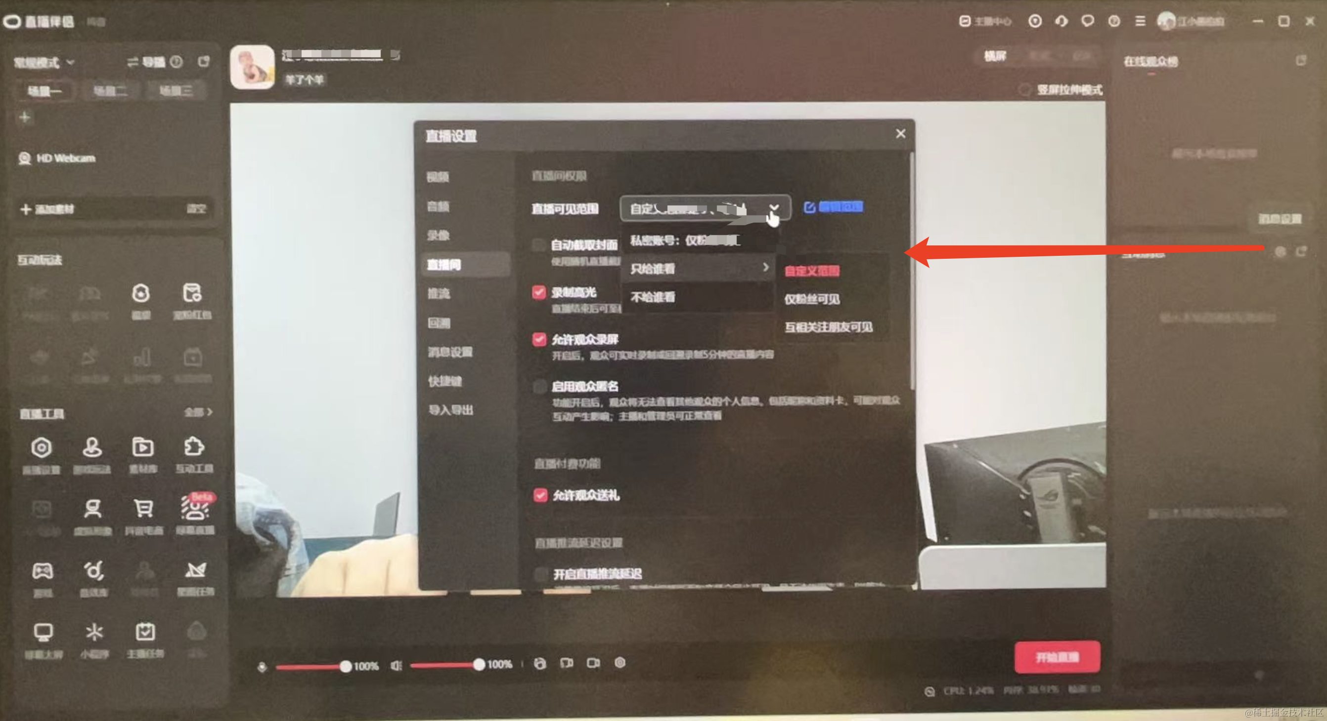 打开抖音伴侣客户端,然后使用抖音登录,开启一个直播,因为是私密账号,不用担心别人看到,只能自己和粉丝看到,也可以在直播伴侣里面设置直播设置,将可以看到的人设置为自定义,然后就只能是自定义的人看到这场直播了